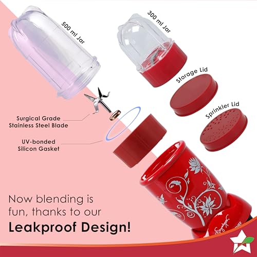 - TRANSPARENT & UNBREAKABLE JARS: Monitor the progress without opening the jars. Use the tall jar (500ml) with a 4-wing blade for mixing-blending and the short jar (300ml) with a 2-wing flat blade for grinding